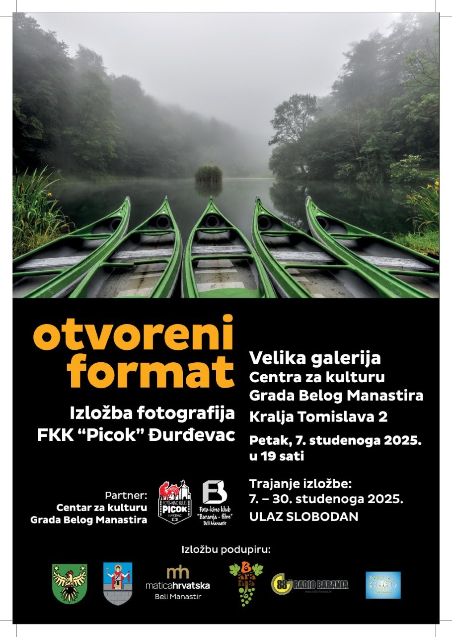 Pod nazivom „Otvoreni format“ u petak će u Belom Manastiru biti otvorena izložba članova Foto-kino kluba „Picok“. Fotografi iz Đurđevca odlučili su se za izložbu u Belom Manastiru nakon redovitog sudjelovanja i brojnih osvojenih nagrada na Salonima fotografije „Minijatura“, koje od 2004. godine organizira tamošnji Foto-kino klub „Baranja - film“.